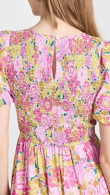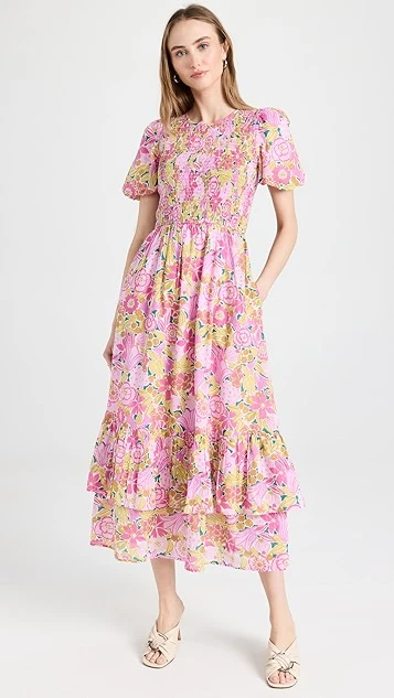 Brilliant multicolor blooms draw the eye to this polished Banjanan midi dress. Soft smocking adds a formfitting touch to the bodice, and the full skirt finishes with a tiered hem. To complete your outfit, opt for gold-tone earrings and heeled sandals.