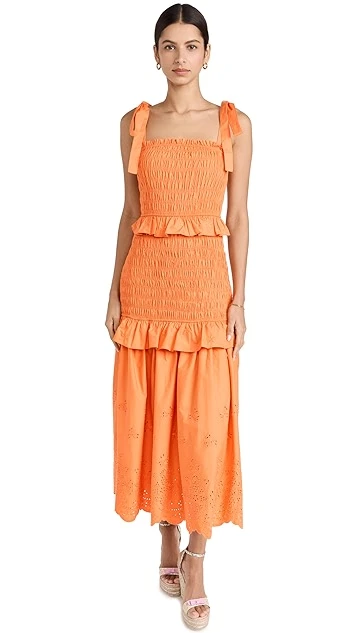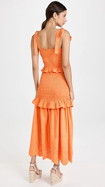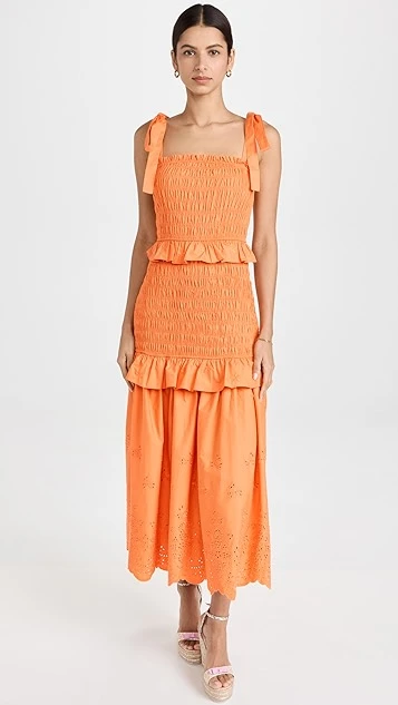 An unmistakable pick for daytime and nighttime occasions alike, this endless rose dress features lots of captivating details, like soft smocking, tiered ruffles, and eyelet patterning at the hem.