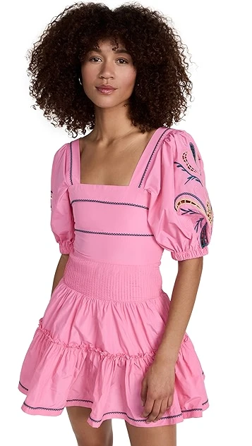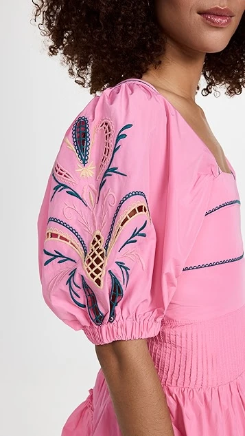 - Short puff sleeves with embroidered eyelet accents and elastic cuffs