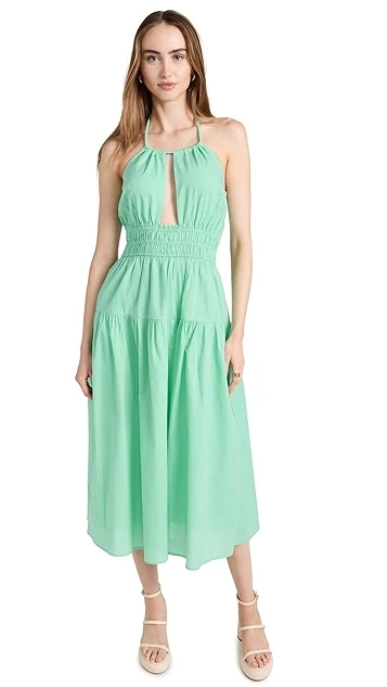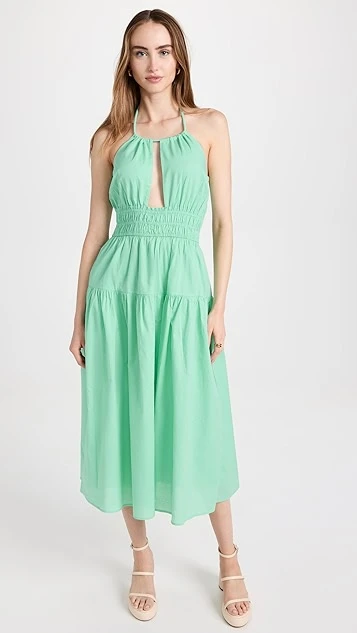 A polished MINKPINK halter dress, offered in a minty shade of lightweight voile. A narrow cutout bisects the bodice, and soft elastic lends a fitted touch to the skirt.