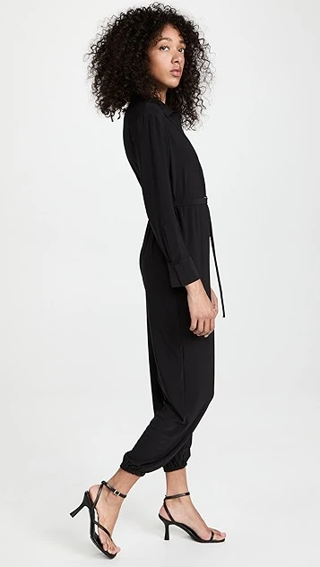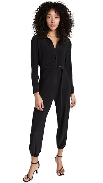 Sporty meets sophisticated on this slinky jersey jumpsuit from Norma Kamali, which features a collared neckline, belted waist, and jogger-style cuffs. Easy to dress up or down, it looks great with anything from heels to sneakers.