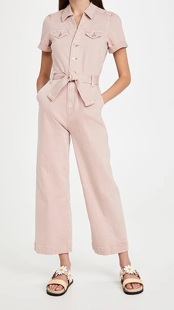 A fresh version of a classic utilitarian style. This PAIGE jumpsuit takes a must-have instant outfit into transitional seasons with rolled short sleeves and a pale pastel wash.