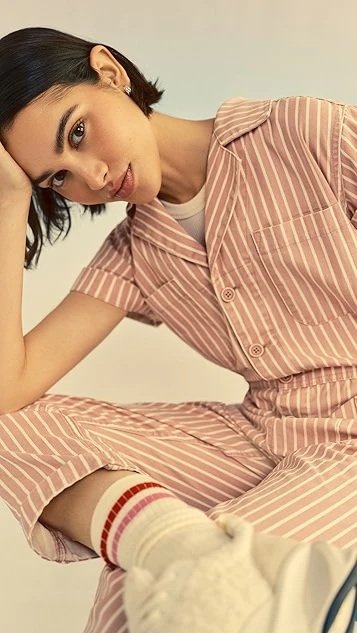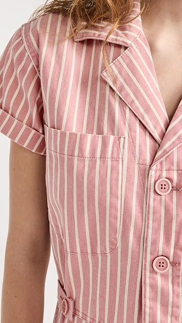 A charming Pistola Denim jumpsuit with a slim cut, featuring a brightly colored stripe pattern and classic utilitarian touches. White loafers and sneakers will both work equally well with this piece.
