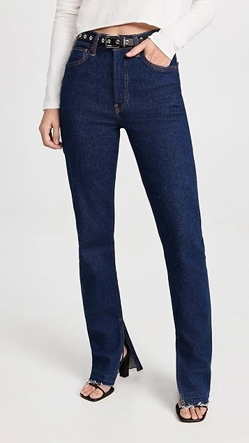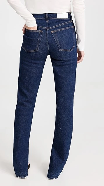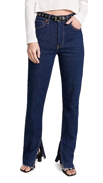 Finding the perfect midpoint between polished and casual, these high-rise RE/DONE jeans feature an inky blue wash, and finish with a raw split hem that adds a vintage-inspired feel to the silhouette.