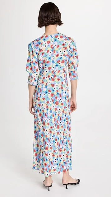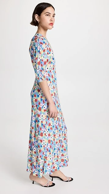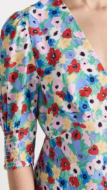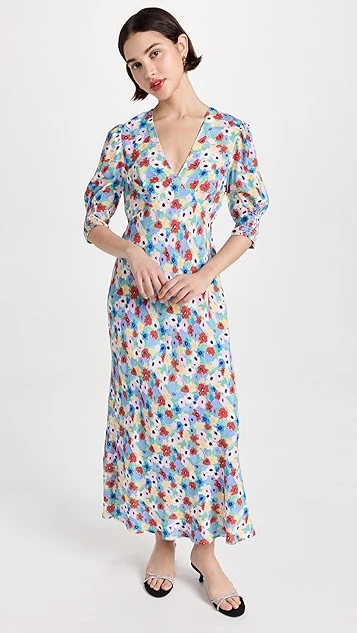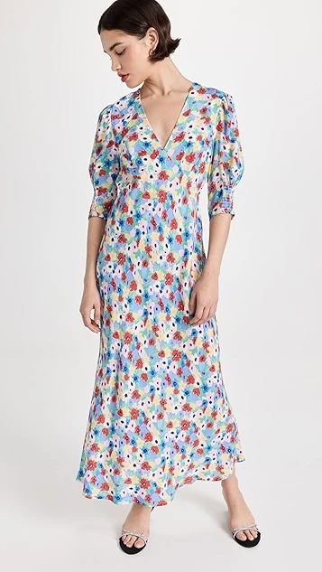 This RIXO midi dress features elbow-length puff sleeves and a V neckline, and is detailed with a breezy floral print. To complete your look, add your favorite sandals, and accessorize with gold hoop earrings.