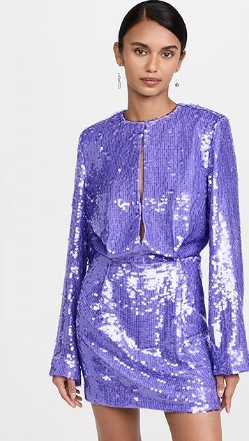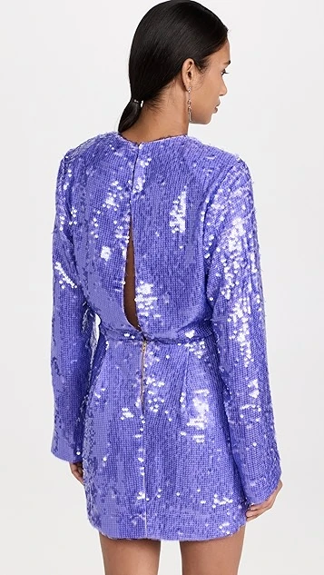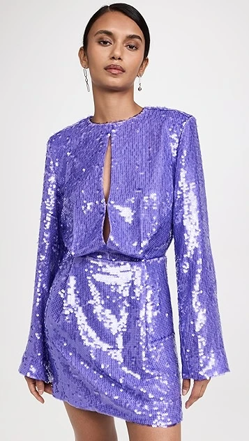 Covered in shimmery, light-purple sequins, this Sabina Musayev mini dress is sure to dazzle. Deep keyholes in front and back lend a unique detail to the silhouette. Crystalline earrings will work nicely as a complement to this piece.