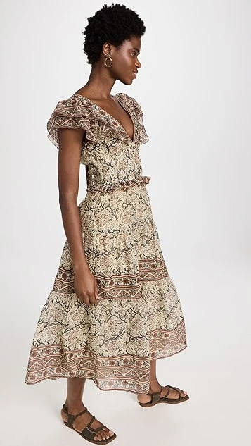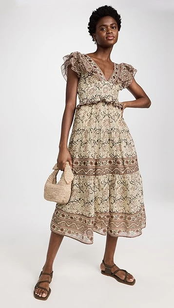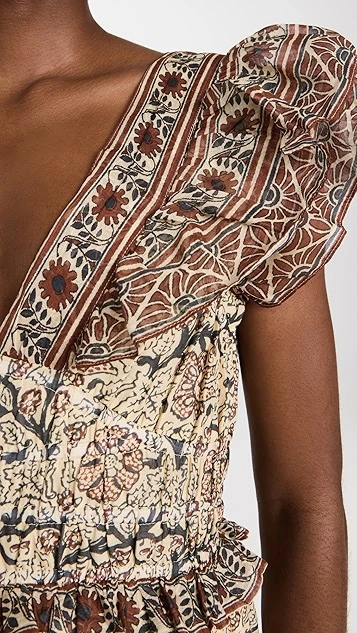 A feather-light Sea dress with a polished feel, featuring ruffly shoulders and muted mixed prints. Take advantage of the deep-V neckline and give a favorite necklace the spotlight, and complete your outfit with flat sandals.