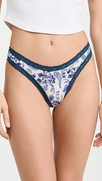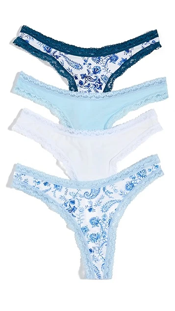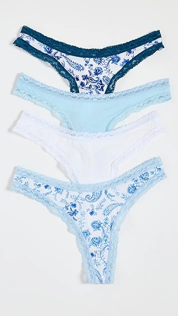 A 4 pack of Stripe & Stare thongs, featuring a mix of blue hues, lace trim, and classic paisley patterning.