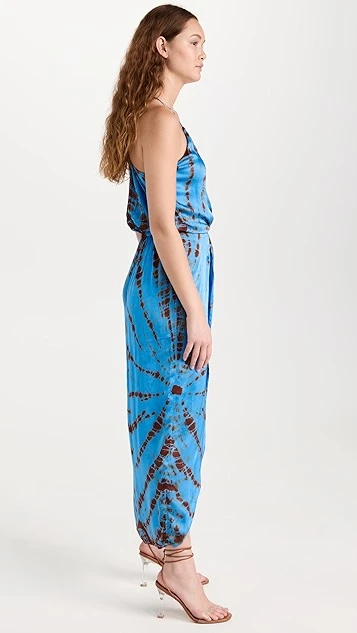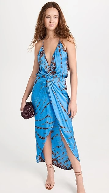 A cool and comfortable summer day dress from Young Fabulous & Broke, featuring the brand’s signature tie dye patterning. A twist at the waist adds a touch of extra emphasis to the surplice neckline and deep front slit.